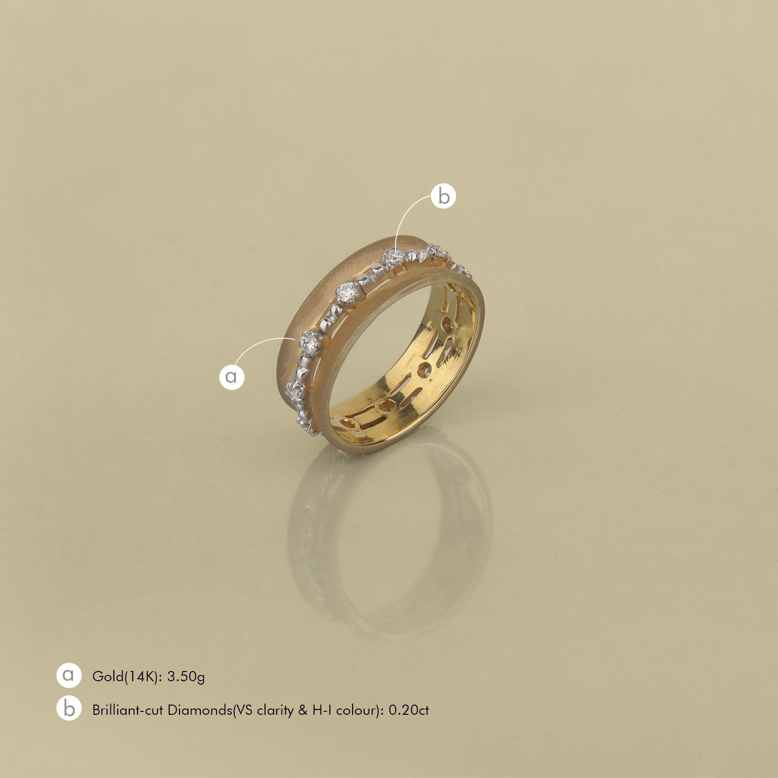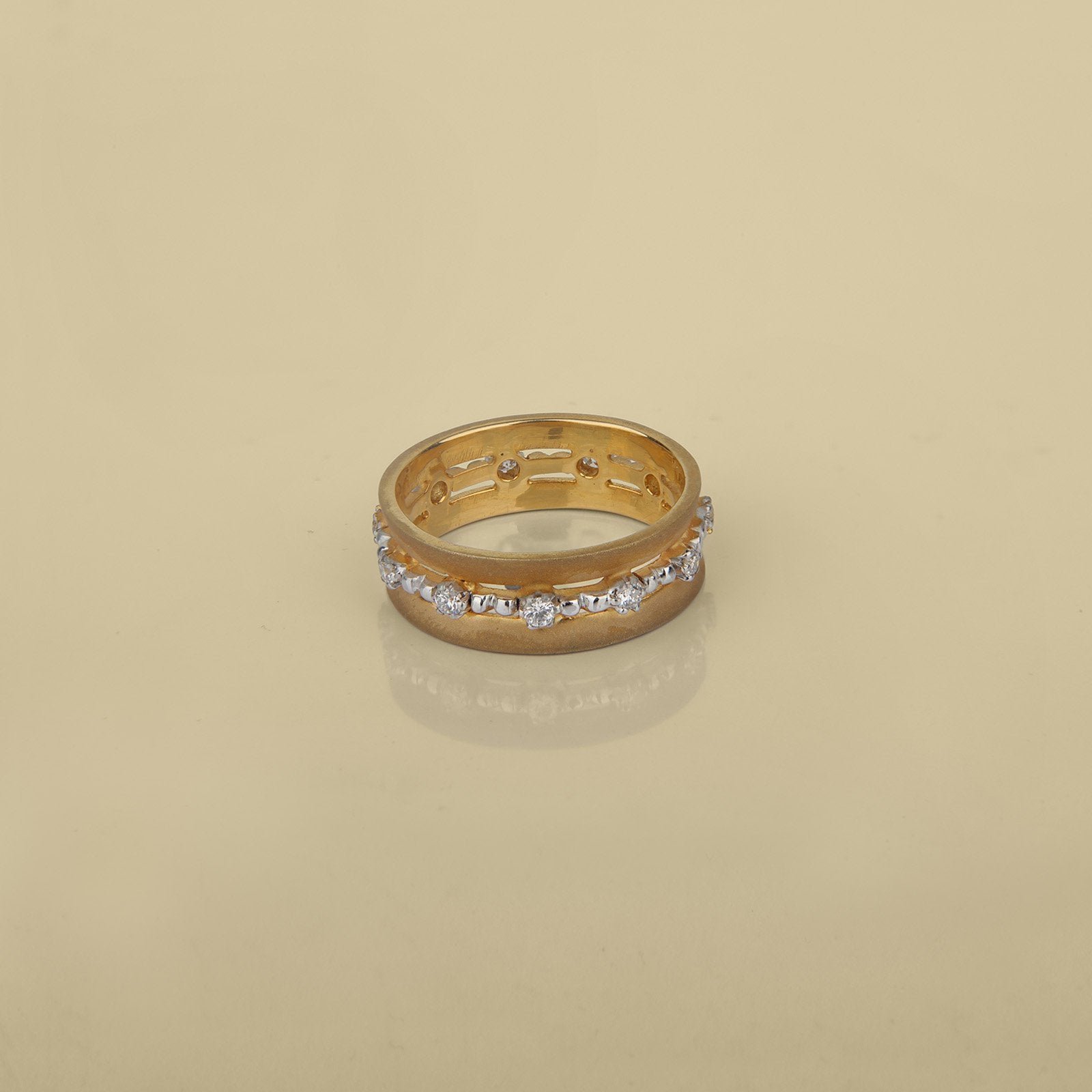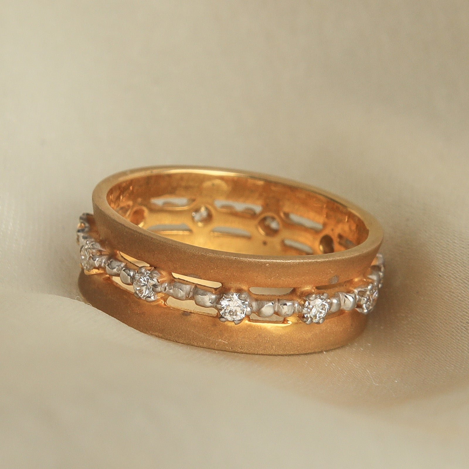 There’s beauty is simplicity! We stand by this and this ring is our attempt at just that. A plain matte finished band worked in gold with a centre band of prong-set natural diamonds.